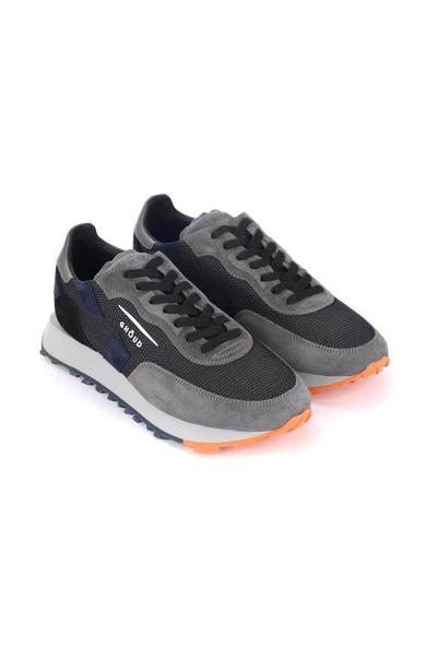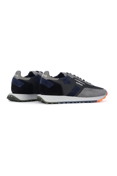 Sneaker Ghoud haast een laag model gemaakt van gaas en zwart suede. Blauwe en grijze details. Verwijderbare lederen interne zool rubberen zool met chips gemiddeld breder dan de norm