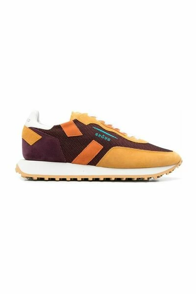 Ghoud sneakers Rolm low-top suede sneakers van Ghoud met paars, geel, kleurblokpanelenontwerp, suede lambrisering, logo-print aan de zijkant, amandel teen, veterbevestiging vooraan, logo-print tong, merkbelang en platte rubberen zool .