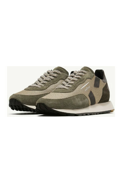 Hedendaagse mode -hardloopschoen, The Rush by Gōud Model. Een minimaal ontwerp gekenmerkt door geometrische en beslissende lijnen. Sla in gevlochten gaas en suede met lederen details voor onderscheidende look. Iconisch logo aan de zijkant gedrukt. Deze schoen heeft een bredere gemiddelde aanpassing dan de standaard. We raden u aan een halve gelijkspel te kopen wanneer beschikbaar.