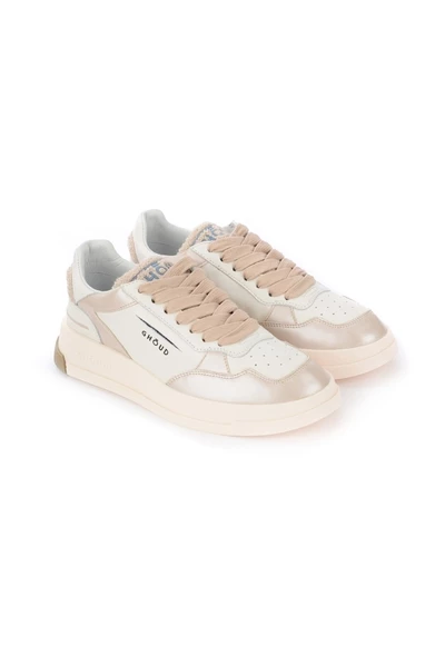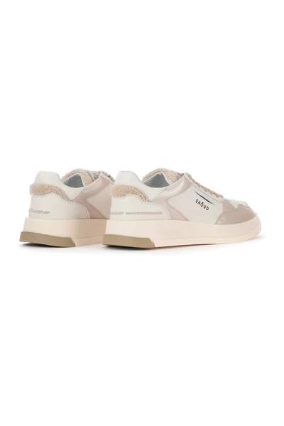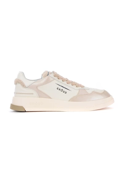 Ghoud Sneaker Model Tweener in ivoor leer en lederen taupe. Inserts in nep -shearling. Ronde tip met doorboorde gedetailleerde interne flap in verwijderbaar leer 1 cm rubberen zool van 2,5 cm